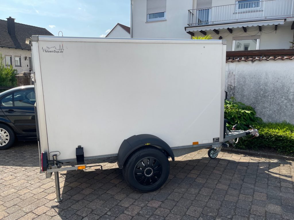 Es ist ein Saris Kofferanhänger (1.350kg) mit einer Ladefläche von (L: 2560 mm / B: 1340 mm /H: 1500 mm). Die 1.350kg Variante ist auflaufgebremst, was das Fahrverhalten positiv beeinflußt.